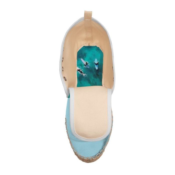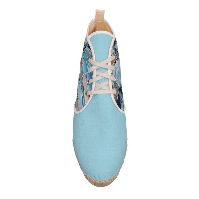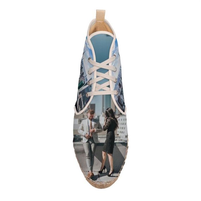 Your personalized ankle espadrilles are handmade in our facility. Your photos will be printed onto the canvas material by one of our technicians. This will be printed with eco-friendly inks, in full glorious color. Once this has been done, the printed espadrille canvas will be passed onto one of our team of skilled craftsmen. They will then cut each of the panels to the required size and shape. This way we can ensure that your custom ankle espadrilles are printed edge to edge without white parts left at the sides.