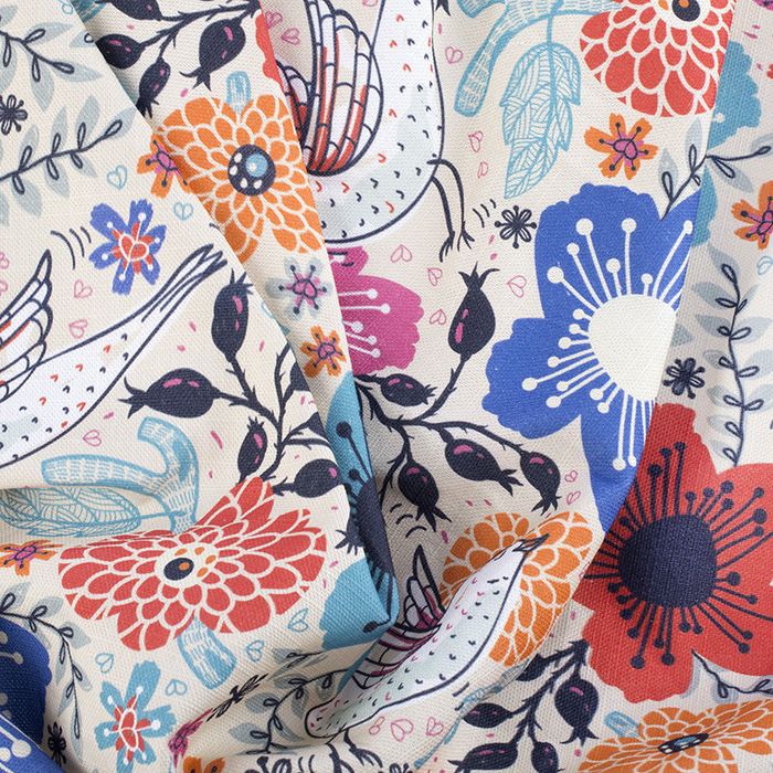 Lightweight bright white cotton, with crisscross texture. Sharp and defined pigment print with bright colors and deep blacks, working well with the classic slub texture. Uses: Garments like shirts, dresses, light jackets, and homeware items such as tablecloths, napkins, tea towels, bedding.