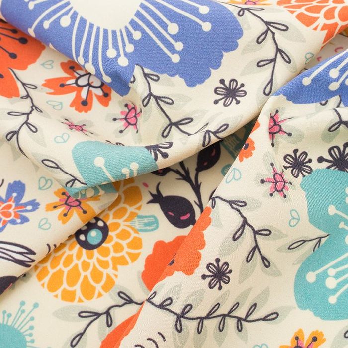 Floaty and buttery soft fabric with an elegant drape. Plain woven lightweight 100% viscose with slight stretch in the weft. Super bright colors & deep blacks when layered. Printed using reactive ink chemistry.