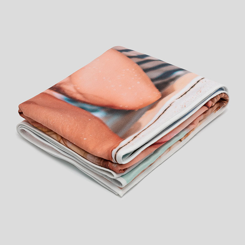 Printing all over towel material is extremely hard to do, but we have optimized the printing on towel textile to ensure balance for the best print and thickness. After printing, the towel feels a little flat but fluffs up with use. The custom beach towels soak up more water, towel weight for weight, than conventional towels.