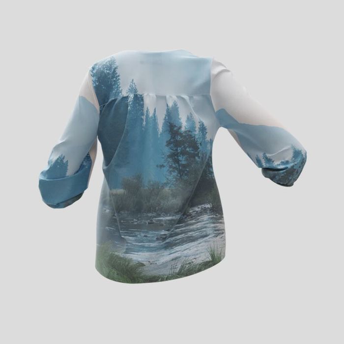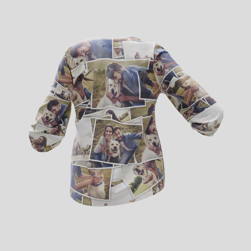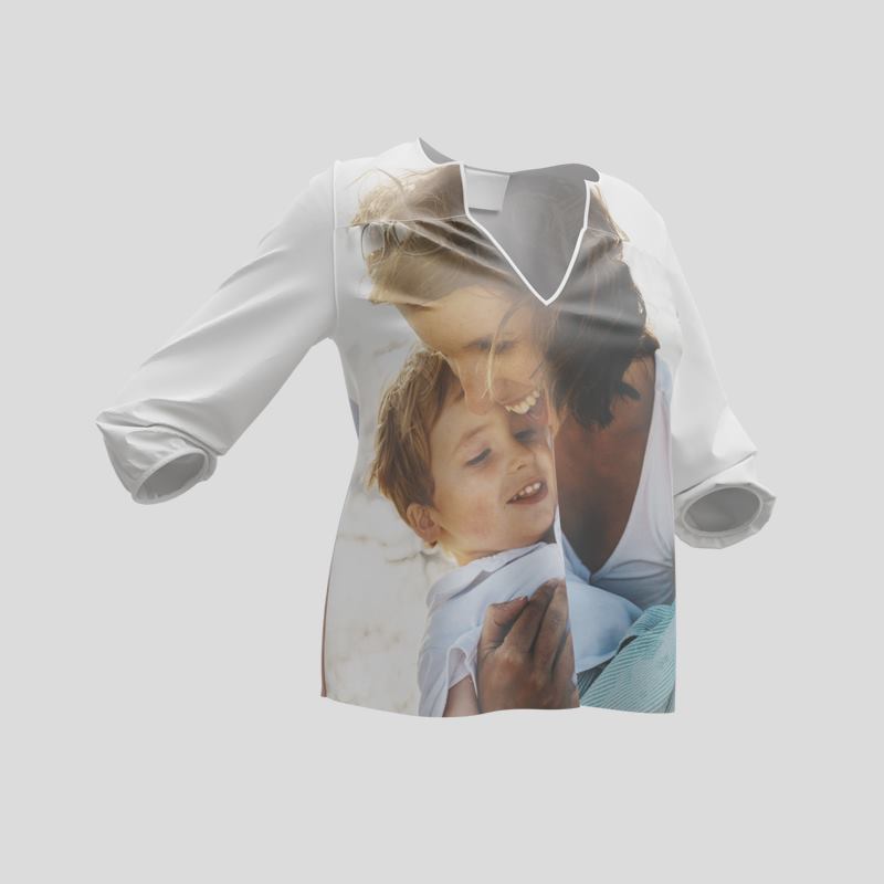 Use our easy interface to create your own blouse. Upload one statement image or build a collage: the preview updates in real time so you can perfect placement, resize artwork, or apply pattern repeat for logos. Tip: keep important elements away from the gathered yoke to ensure they remain visible on the finished garment.