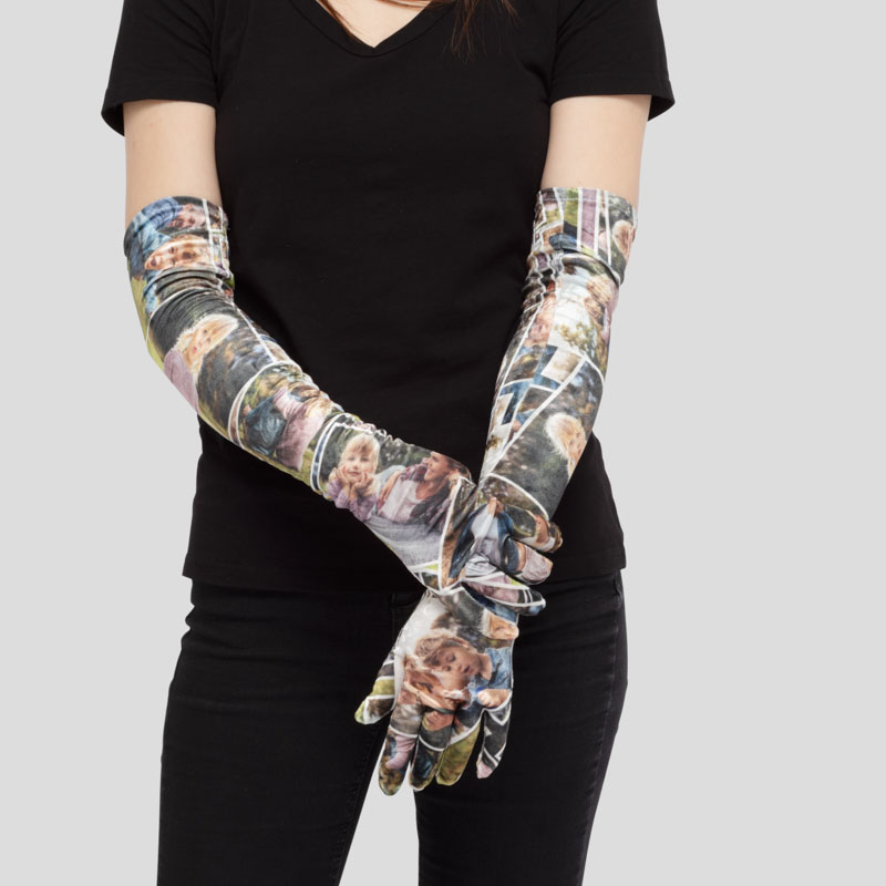 As the print areas of your custom opera gloves are long and thin, we have some helpful design tips. Rather than trying to stretch one photo up the whole length of the glove, you may want to add a couple of different photos to each design area. This way, your photos won't get stretched out and you can have more of them! Use different photos to cover the whole print area, or use a few photos with any background color of your choice.