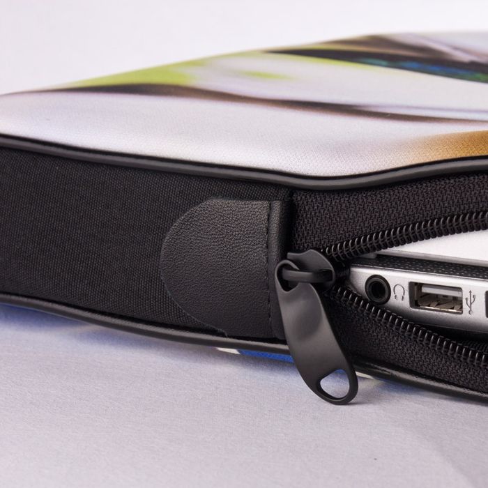 Each personalized laptop sleeve is printed using cutting-edge dye-sublimation for rich, lasting colour. The artwork bonds permanently with the fabric so it won’t peel or crack. Our team then cuts, pipes and stitches the padded neoprene before adding a chunky double zip. Because every sleeve is produced on demand, we start work as soon as you order and usually have it ready to leave the studio within two working days, so you can enjoy your new gear sooner.