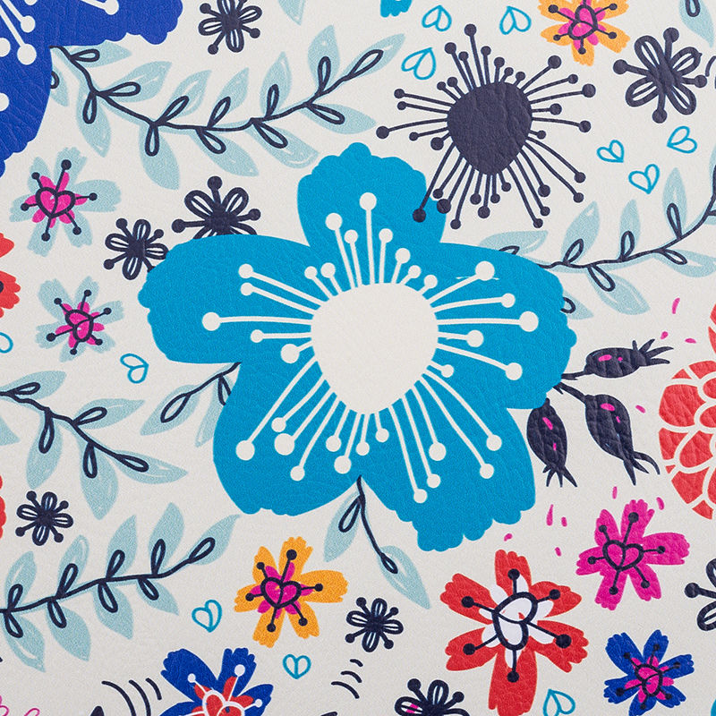 The white PVC face has a chic finish with a slight sheen, which is very reminiscent of real leather. However, there are no animal products used in this material, and it is completely vegan. If you are looking for leatherette material for upholstery, then this is perfect for you. The gorgeous texture of the material does not interrupt the lines of your design, but instead gives them extra character and charm. With a bright white base tone, colors look simply stunning: bright, vivid, and full of life. If your design contains lots of details and fine lines, then they will be reproduced with exceptionally high quality on this custom printed faux leather fabric.
