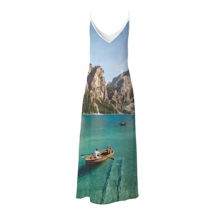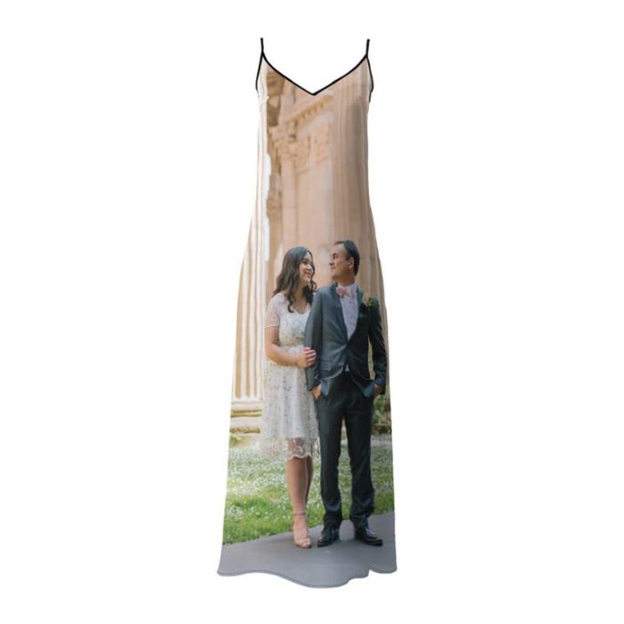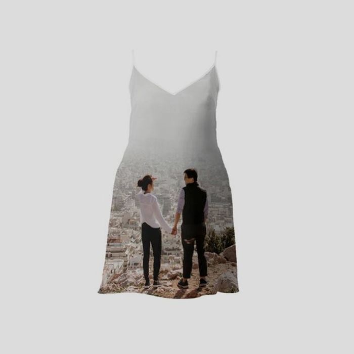 This personalized printed slip dress is so beautiful and elegant that we struggled to pick out our favourite ideas for it. The lavish cascade of the flared bottom from the tapered waist reminds us of water; this could be an ideal moment to use all of those holiday snaps that you took and didn't think you would do anything with. Waterfalls would be on the perfect canvas with this long slip dress.