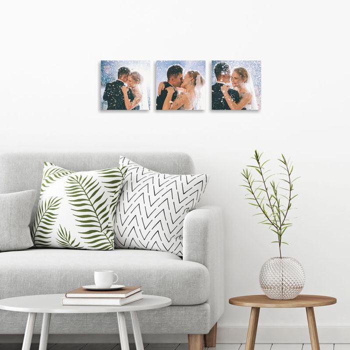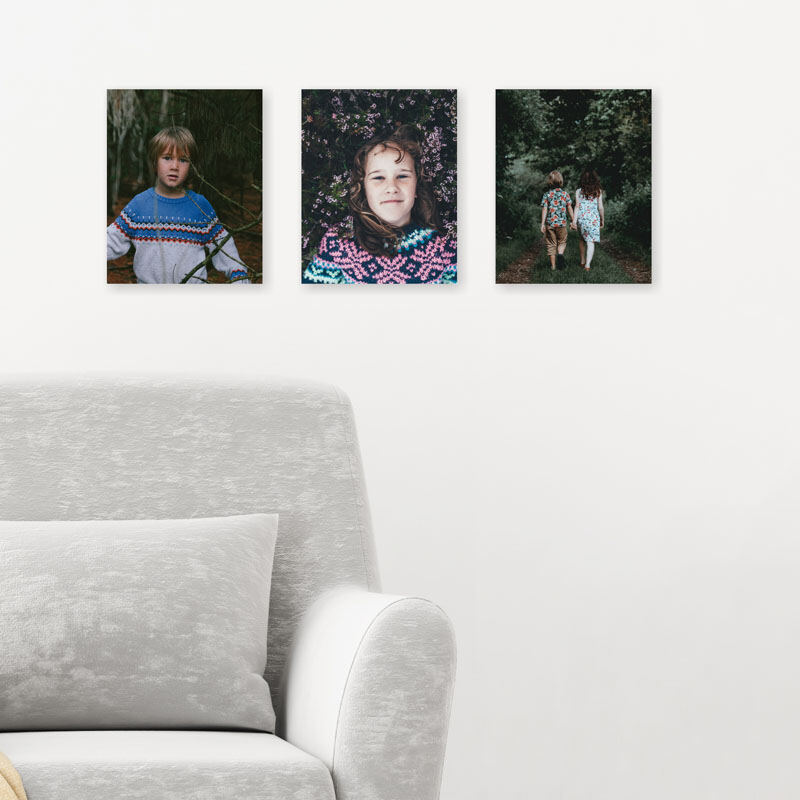 Give each canvas panel its own individual look by changing the filters in our design tool. Leave one of your small photo prints in full color but edit the other two to black and white and sepia. When hung in a diagonal line or random cluster, this quirky design will look striking.
