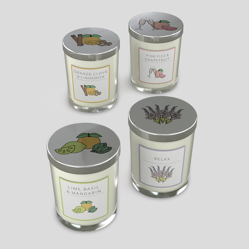 There are three printable areas: the steel lid, the glass sticker and the gift box. For a crisp result, use high-resolution images and avoid placing important details right at the edge of the curved jar. Repeating a smaller motif works beautifully for monogrammed candles, while a single full-bleed snapshot is ideal for a birthday or wedding photo candle.