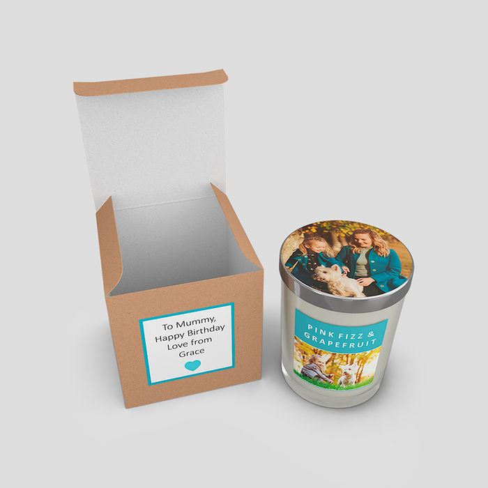 Your custom photo candle arrives in a handy gift box. Full dimensions: