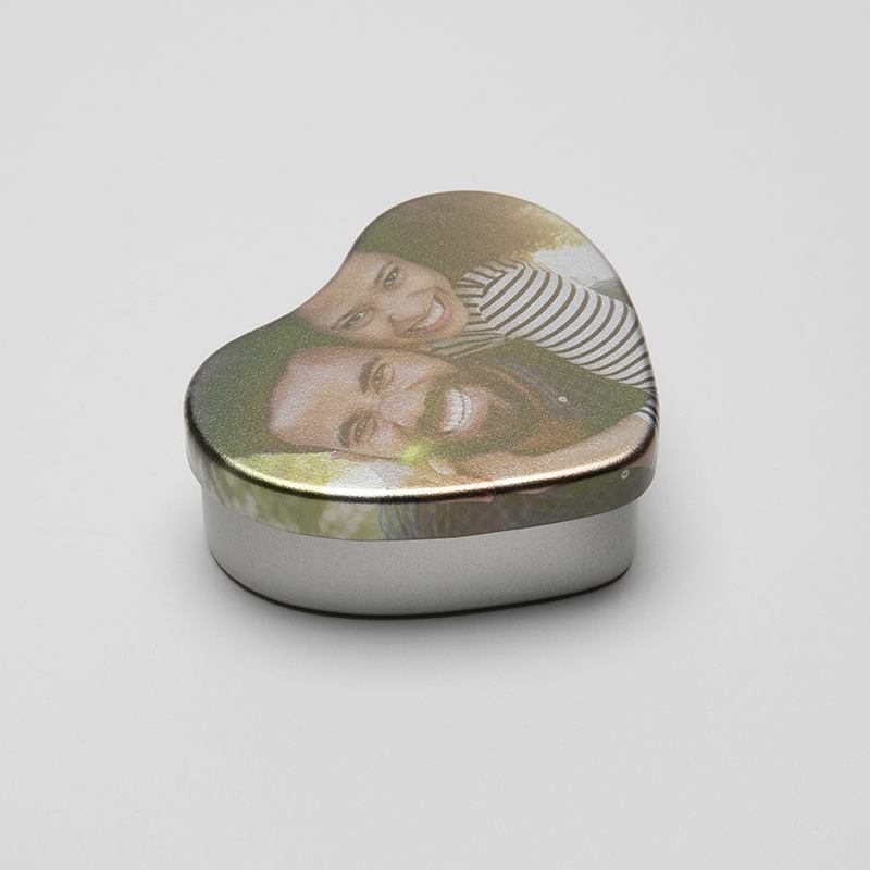 Your design is printed using a specialist deep infusion technology. This makes sure that we bond your design to the lid of your personalized heart tin. Once complete everything is assembled, quality checked and sent out to you. The whole tin is a silver color, which gives your finished print a beautifully authentic finish. We use no white inks, so please be aware that any parts of your design which is white will be left unprinted, showing the silver color.