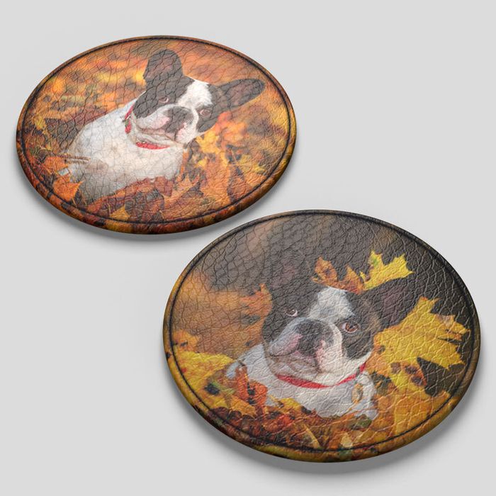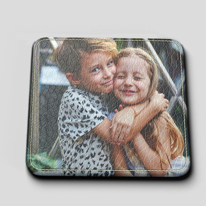 If you don't want to use photos for your personalized leather coaster set, you can select a block color background and add text. Why not add the initials of each member of the family to a different coaster?
