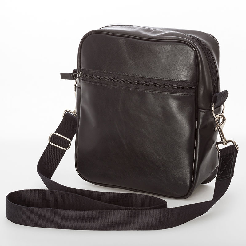This stylish bag is done in a messenger-style, but is perfect for use as a personalized men's shoulder bag, personalized travel bag, and custom purse. The spacious large compartment is perfect for storing a tablet, books, a wallet, and any accessories you might also carry. There are 3 secure zip-close pockets for safe-keeping of smaller accessories. Made from high-quality black Nappa leather with a soft Suede Vision fabric interior, we print your custom design onto the bag's premium textured canvas.