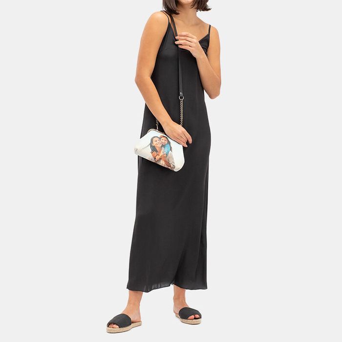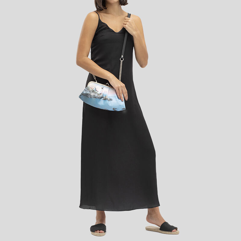While you're designing your custom metal frame clutch, there are a few pointers to keep in mind. You'll be able to personalize the front and back of your bag, and both panels will be stitched together at the side. The sides of the bag are folded in to create the clutch shape, so be aware that design elements may be distorted here. To minimize the effect of this, simply keep your photos and most important design elements central on the flat clutch. For the pleated bag, the design will be warped with the pleats. We recommend using patterns or abstract images rather than photos of people or pets. All of this is visible in the design interface, so you'll be able to make sure your personalized metal frame clutch bag looks the way you want.