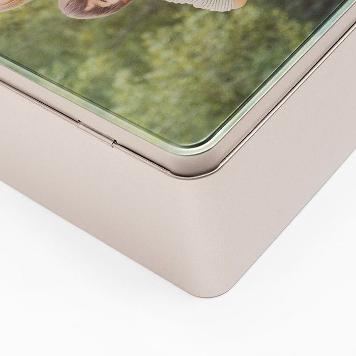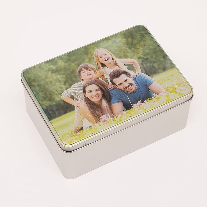 The tin personalized sewing box is expertly handmade to order in our studios. We print your photos directly onto the lid using a specialist process, so your designs resist fading and won't scratch off. As we do not print any white underneath your photos, the finish is a rustic, authentic 'etched' effect, adding extra charm to your personalized craft box.
