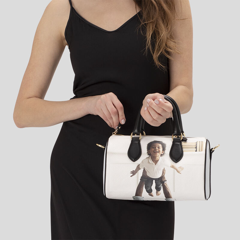 Your custom barrel bags are handmade to order in our studio by a team of experts. Once we receive the designs for your personalized small duffle bag, the leather is carefully printed with your photos. Then our team of leatherworkers will cut, shape, and stitch your bag from scratch. Each piece of leather will be stitched together one by one. We finish it off with black Suede Vision lining and polishing the metals to make sure it is completed to a high standard. Once we are happy and know that you will be too, we will send your bag out for delivery.