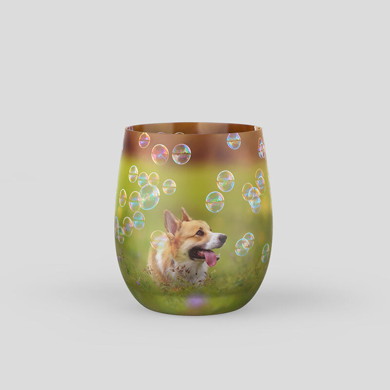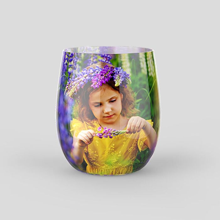 Print your photos or text onto the front and back of the glass. Please keep in mind that your two designs will meet at the seams, so if you are looking for a smooth finish, try a photo on one side and leave the other plain with just text.