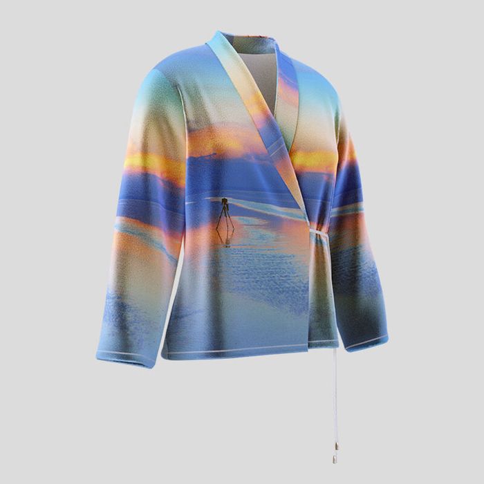 A women's custom wrap jacket is a chic alternative to a blazer. Pair with tailored trousers for the office or jeans for weekend brunch. Use one striking photo for a statement look, create a collage of memories, or add text for a branded garment. The choice of two contrasting fabrics means you can design your own wrap jacket for every season.