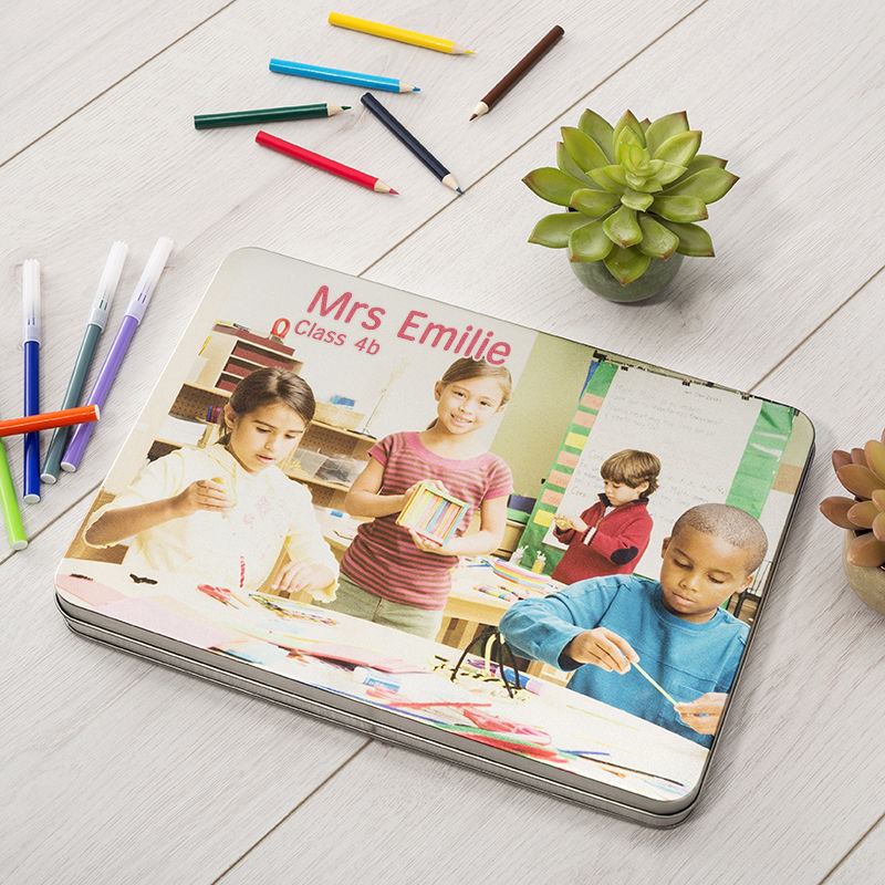 Tidy your workspace and travel in style with a personalised pencil case tin.