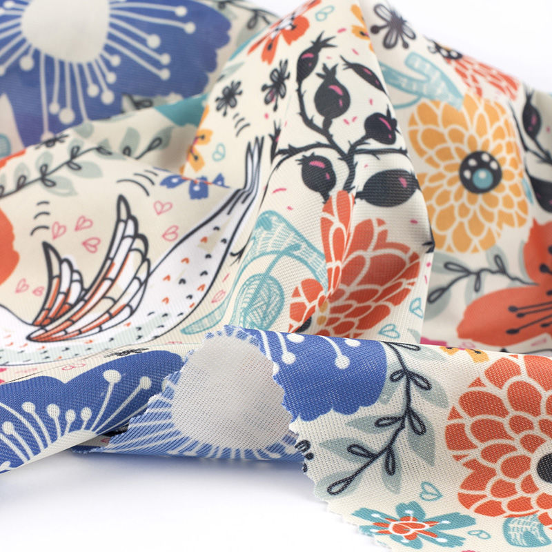 All your custom made printed fabric orders are printed digitally. We use different methods for this based on the type of textile that is being used. These methods include pigment printing, which prints onto a localized part of the fabric with colored dyes, building up your personalized design. Another method we use is dye sublimation. This is a two step process in which we first print your design onto a transfer paper, and that is then bonded using heat to the fabric itself. Both of these methods create a full color print.
