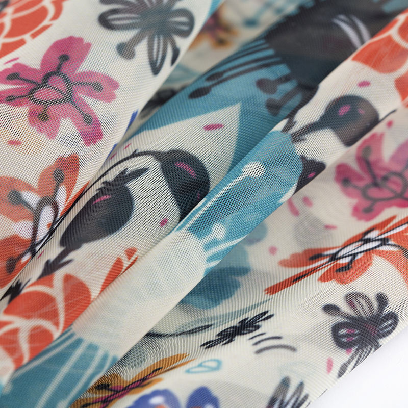 Printed voile fabric is a very fine textured mesh that feels like a delicate net.